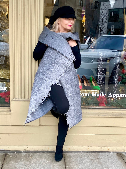 BOUCLE ITALIAN WOOL FOX TRIM COAT - LIGHT BLUE