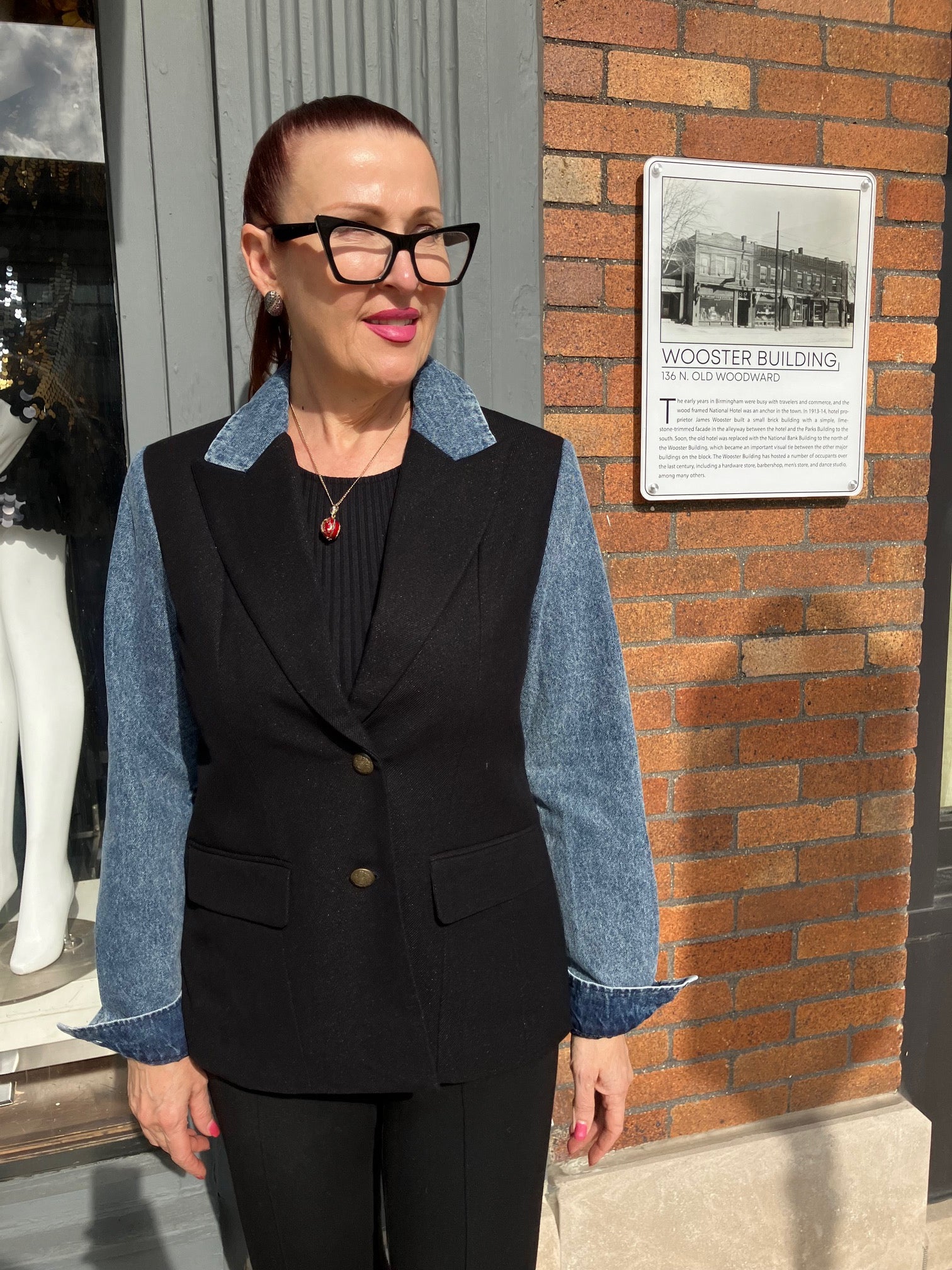 Elevate your wardrobe with this striking two-tone black and denim design. This tailored blazer offers a refined silhouette that effortlessly blends classic tailoring with modern edge. Perfect for both professional settings and stylish evenings, it provides a versatile layering option that enhances your look with understated sophistication. Crafted to ensure a flattering fit, this piece balances structure and comfort for a polished finish.