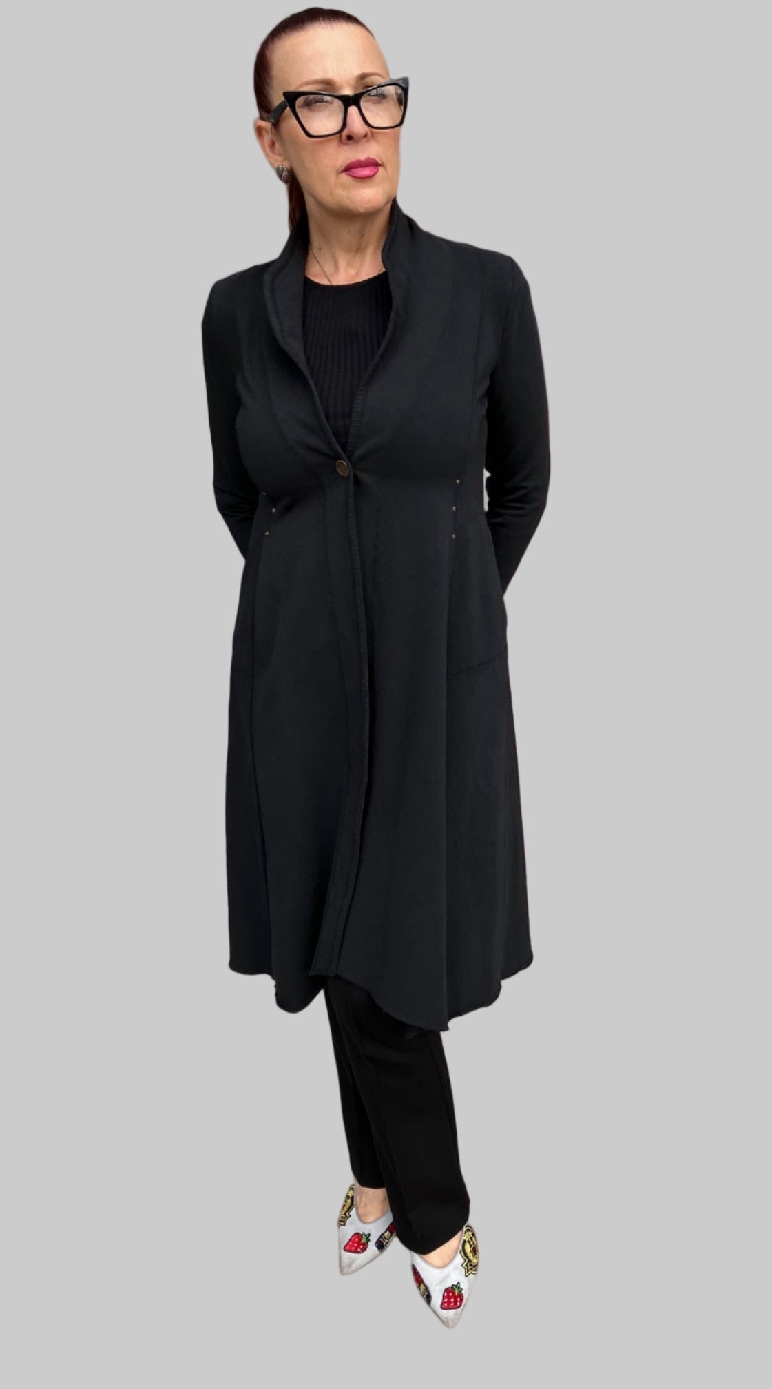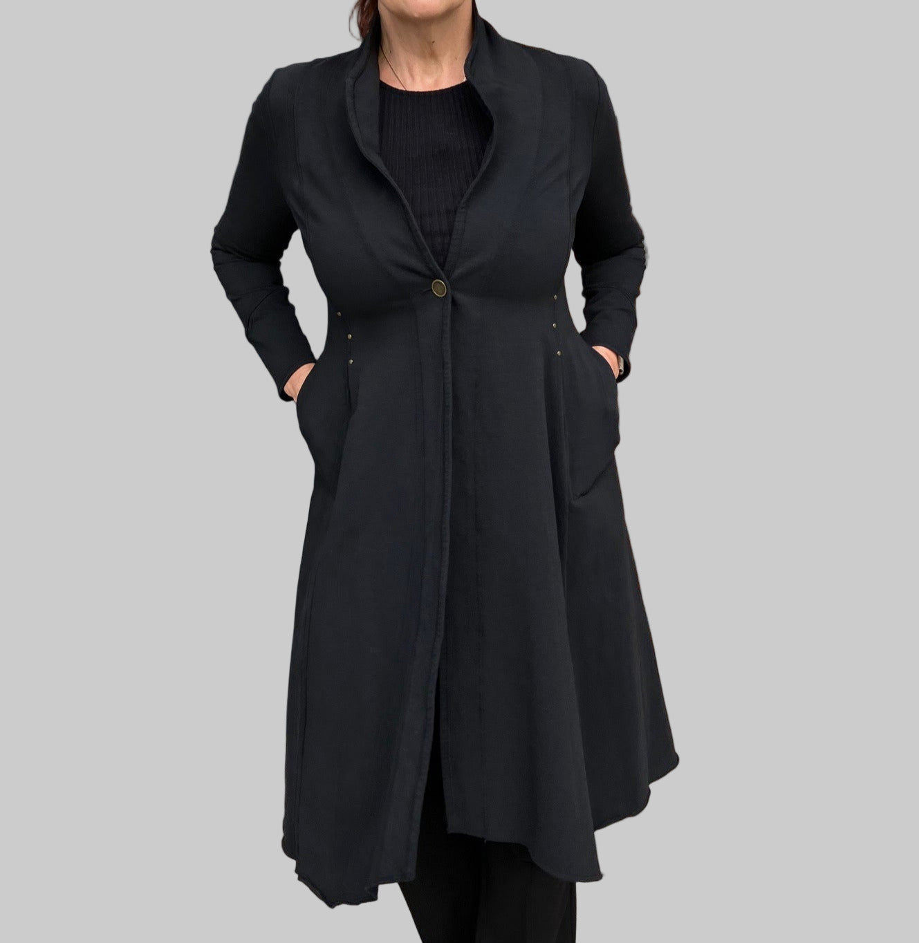 Elevate your wardrobe with the Smoke Black Studded Jacket, featuring a sophisticated fit-and-flair silhouette. Crafted from soft stretch fabric, this jacket ensures exceptional comfort and a flattering shape. Detailed stud embellishments add a subtle edge, making it perfect for both elegant and bold statements.