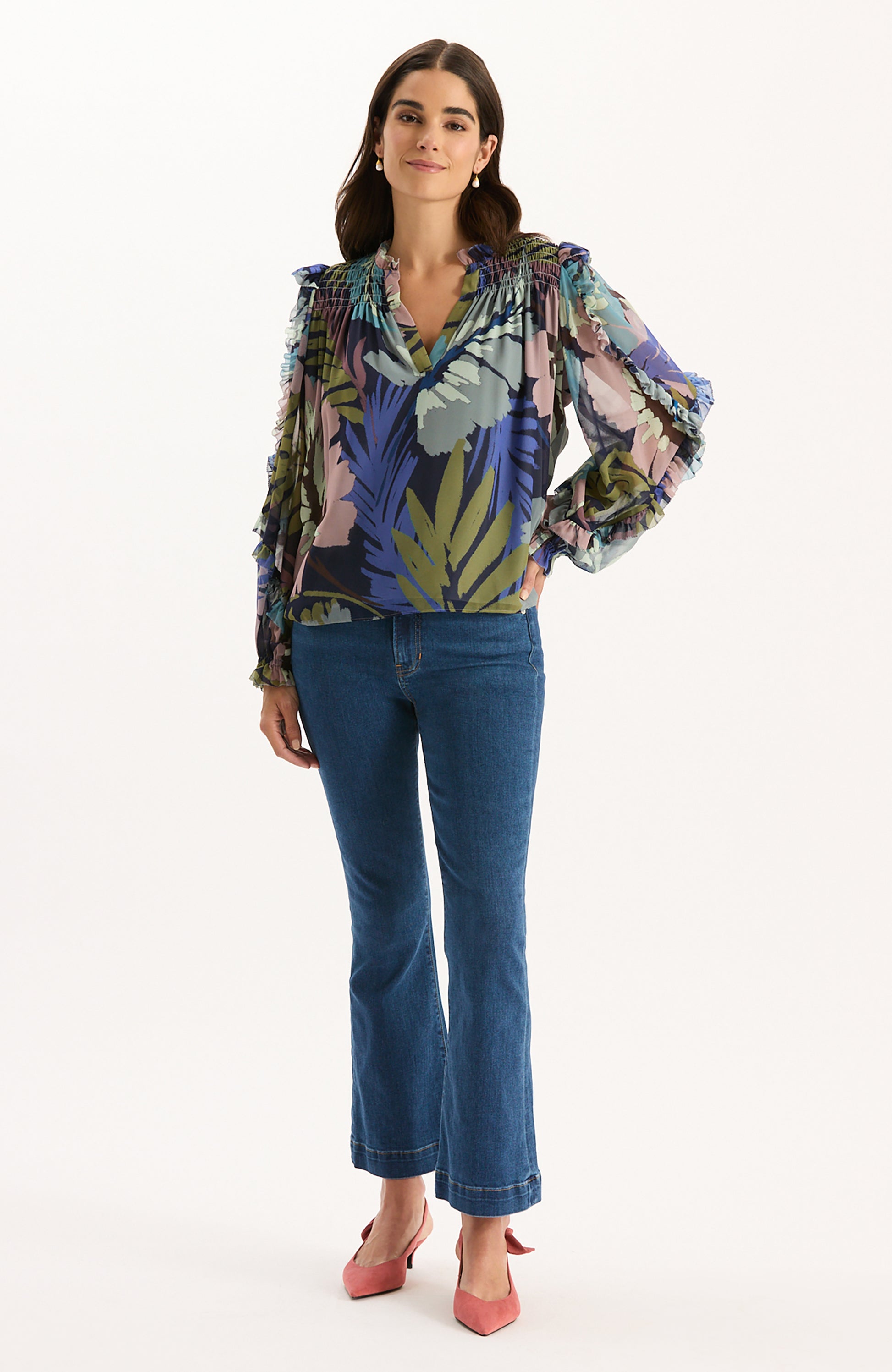 The Sylvie Silk Blouse showcases a stunning floral-inspired pattern with vibrant, elegant colors. Its lightweight, flowy fabric offers effortless movement and comfort. Intricate detailing enhances its refined design, making it an impeccable choice for a polished, sophisticated look.